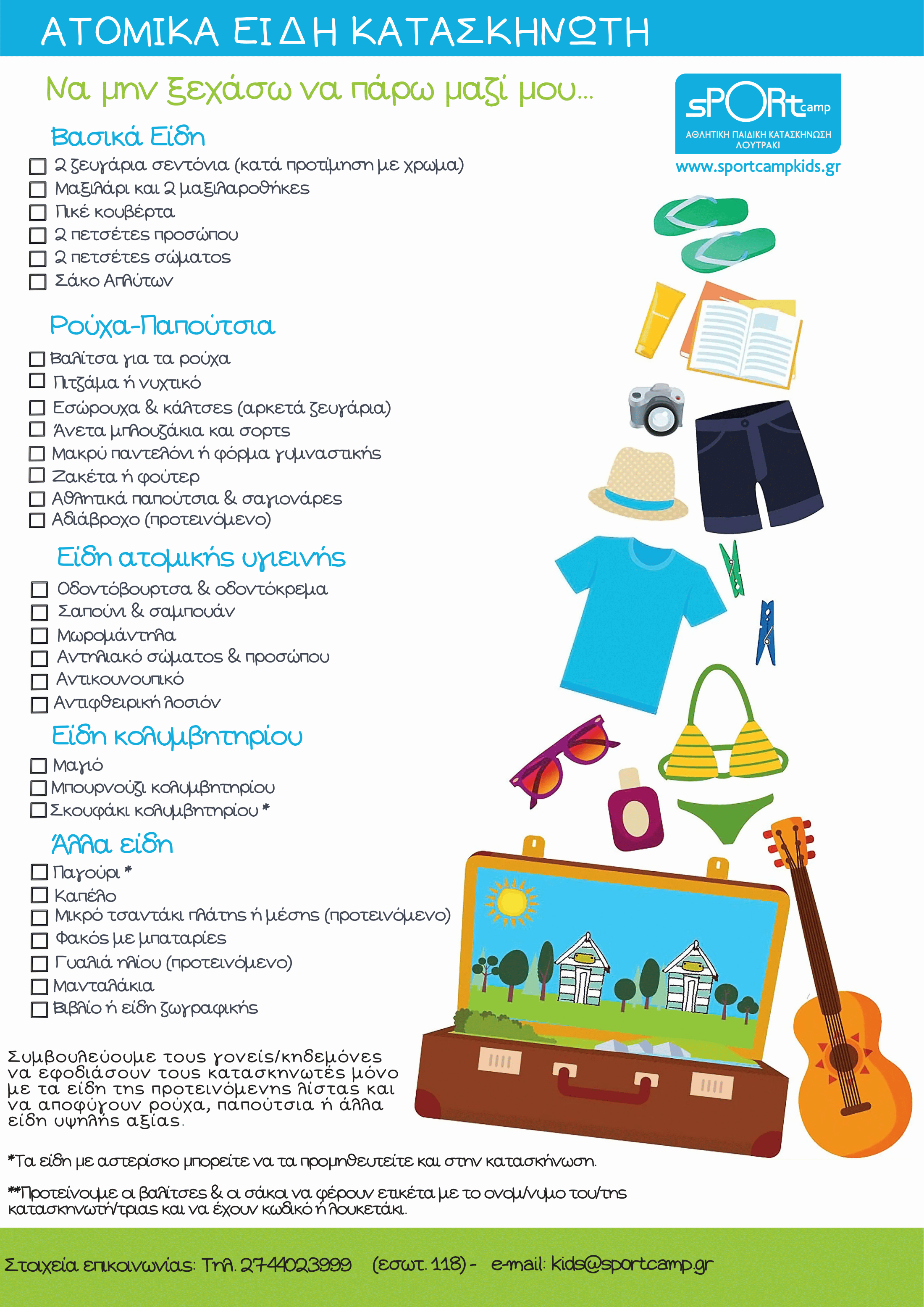 Είναι πολύ σημαντικό οι κατασκηνωτές να έχουν μαζί τους όλα τα απαραίτητα είδη ώστε να εξασφαλιστεί ότι κάθε παιδί θα ζήσει την πιο αξέχαστη καλοκαιρινή εμπειρία στην κατασκήνωση μας. Για αυτό το λόγο, συστήνουμε στους μικρούς μας φίλους να εφοδιαστούν μόνο με τα είδη που αναφέρονται στην λίστα που ακολουθεί και να αποφύγουν αντικείμενα αξίας, όπως ρολόι, tablet, i-pod ή ηλεκτρονικά παιχνίδια.